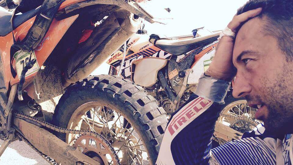 Climbing, accelerating, there follows a climb-down with many rocks. You wanna change to a lower speed in the gearbox. Bad luck! There is no gearbox pedal. It fell somewhere :). There’s no problem, I think to myself, I have a spare one. It’s just that I don’t have a screw to fasten it. I have 80 km left to ride in this special route. I analyze the situation, I use the spare pedal to shift into third gear and I ride like this for the rest of the day. Uphill-downhill, third gear. The climbings are the funniest. Everyone chooses the safe, technical traces, the second gear or even the first gear and there comes a guy from behind, full speed, because otherwise his engine would stop, and he jumps from rock to rock like a chamois. I’m sure that I amazed some riders from the bottom of the leaderboard as I passed by them, with my climbing techniques in the third gear. Another day, I follow Carlo, I already have a good speed and I use the navigation without reducing the speed at every point on the roadbook; I realize two things: first off, on off-road not every trace has a finality. It can end abruptly into a pothole. And second off, a bit more critic, the brake fluid DOT4 is not for competitions. Especially when you ride fast and you hit the brakes suddenly, it overheats and the brakes won’t hold anymore. :) What a pleasant surprise to find these two things combined. The front wheel gets stuck into a crevasse in the road and the motorcycle simply stops from 40-50 km per hour to 0, all of a sudden. No problem. I stop with the navigation on my chest, all the air from my lungs gets out, and in just two minutes I’m able to breathe again. All this time I shout like a little girl stung by a bee. I didn’t know what to do, how to control myself. All these things you do them on the fly. Something tells you that you have to go on. You cannot stop. You can cry and shout while riding, it’s as comfortable as it would be if you stop and pity yourself. Anyway, this cannot be seen in the photos. The layer of sand on your helmet and glasses protects you from the shame of seeing your tears in photos. Everything is ok.